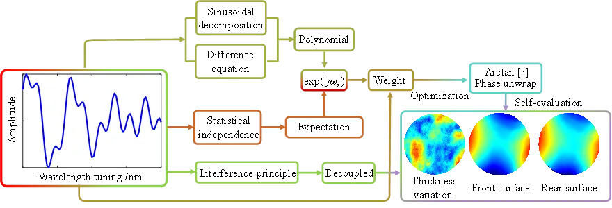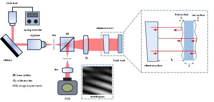 文章提出一种空白掩模版表面形貌和厚度变化同步测量的波长调谐移相干涉方法,避免了传统傅里叶变换方法因采样均匀性导致频谱失真降低测量精度的问题,同时,该方法利用不加权因子降低异方差噪声的影响,旨在提高空白掩模版表面形貌和厚度变化的表征精度,为解决我国高端装备制造所面临的“卡脖子”难题提供了技术途径。