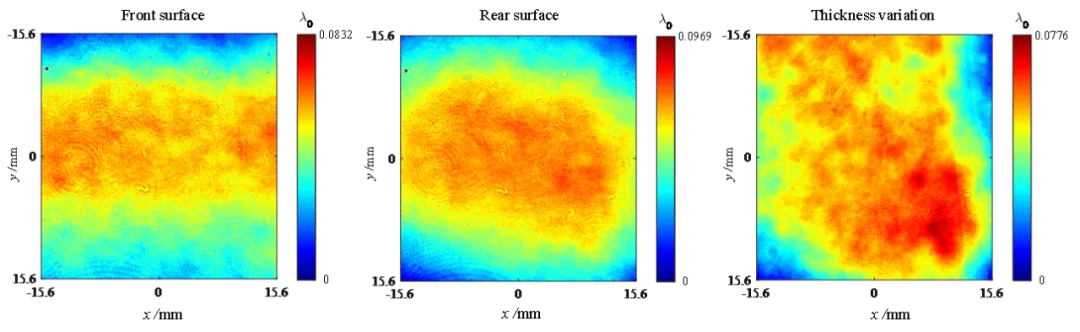 基于Fizeau型波长移相干涉仪对厚度为6.35 mm、折射率为1.45的空白掩模版的厚度变化、前表面和后表面的形貌进行测量。在3次重复性测量中,误差自评价指标分别为7.5656×10-3 λ0, 7.5608×10-3 λ0和7.5635×10-3λ0。
