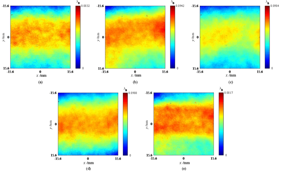 除此之外,多次改变被测空白掩模版与干涉仪参考镜间的距离,在距离依次为18. 5 mm、27. 7 mm、37. 0 mm、46. 2 mm和55.5 mm下,对应的厚度变化、前表面和后表面的PV测量结果的标准差分别为6.9×10-3 λ0,8.1×10-3 λ0和7.6×10-3 λ0,对应的RMS测量结果的标准差分别为9.12×10-4 λ0,6.67×10-4 λ0和6.87×10-4 λ0,其中,如图4所示展示了前表面的测量结果,这些结果说明研究方法具有较好的测量有效性和稳定性。
