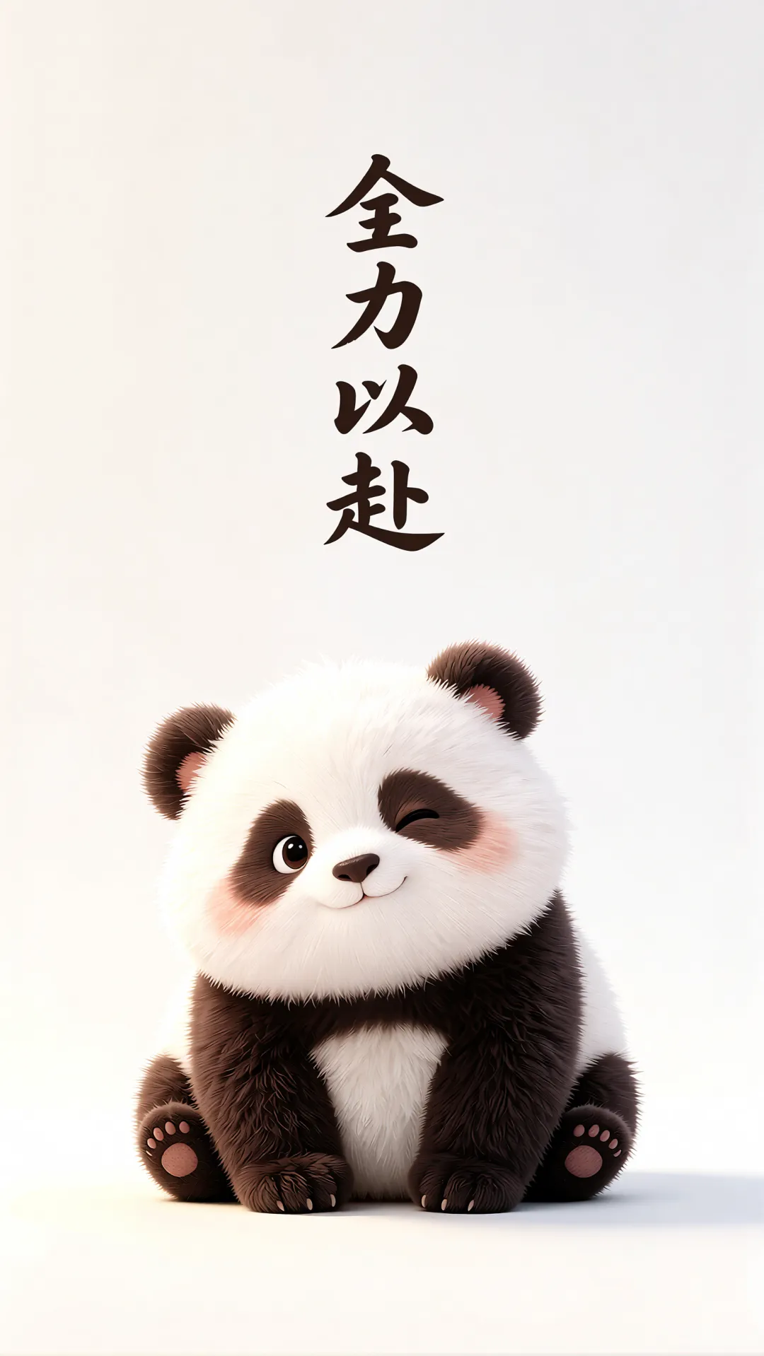 帮我生成一张9:16竖版高清图片,8K超高清,细节拉满,壁纸质感,光影柔和,颜色清爽柔和不刺眼,无水印、无杂乱背景,画面干净通透,镜头参数:f/1.8,ISO 100,快门1/125s,焦距50mm;软萌治愈风,奶白色浅底(低饱和柔色),左下角放置软乎乎卡通小熊猫(圆滚滚坐姿,歪头眨眼,耳朵带浅粉腮红,毛发蓬松),毛笔字“全力以赴”居中偏上,文字颜色选用深墨色(浓而不沉,醒目不突兀),与奶白色底色形成柔和对比,既突出文字又不破坏整体柔和调性,字体圆润柔和不潦草,比例协调(卡通形象占画面1/4,文字占1/5),无多余装饰,色调统一柔和,萌系氛围感拉满