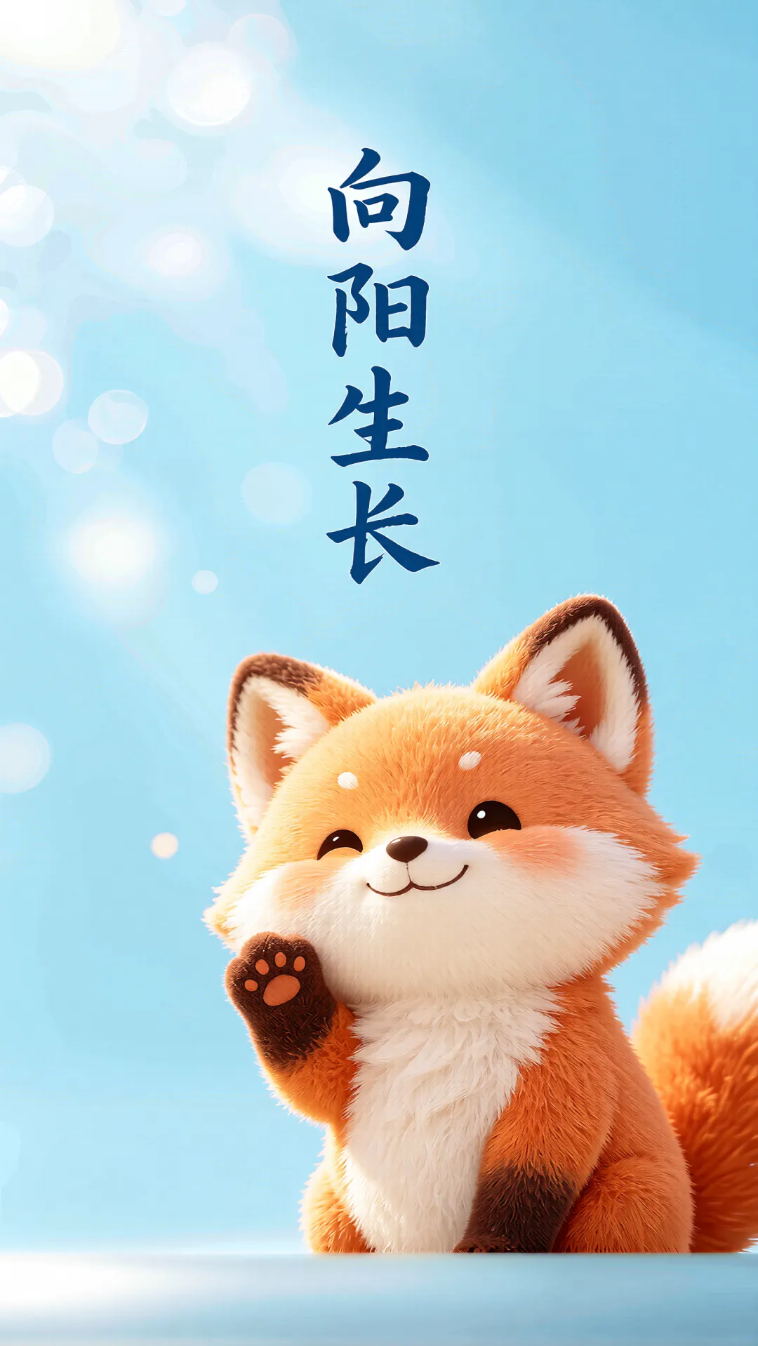 帮我生成一张9:16竖版高清图片,8K超高清,细节拉满,壁纸质感,光影柔和,颜色清爽柔和不刺眼,无水印、无杂乱背景,画面干净通透,镜头参数:f/1.8,ISO 100,快门1/125s,焦距50mm;软萌治愈风,淡浅蓝柔色底色(带细碎柔光光斑),右下角放置软萌卡通小狐狸(短耳圆脸,微笑抬爪,绒毛柔软),毛笔字“向阳生长”居中偏上,文字颜色选用藏青色(柔和不刺眼,与浅蓝底色形成清晰对比,醒目易读),比例协调(卡通形象占画面1/4,文字占1/5),无多余装饰,背景与卡通、文字色调呼应,柔和又可爱
