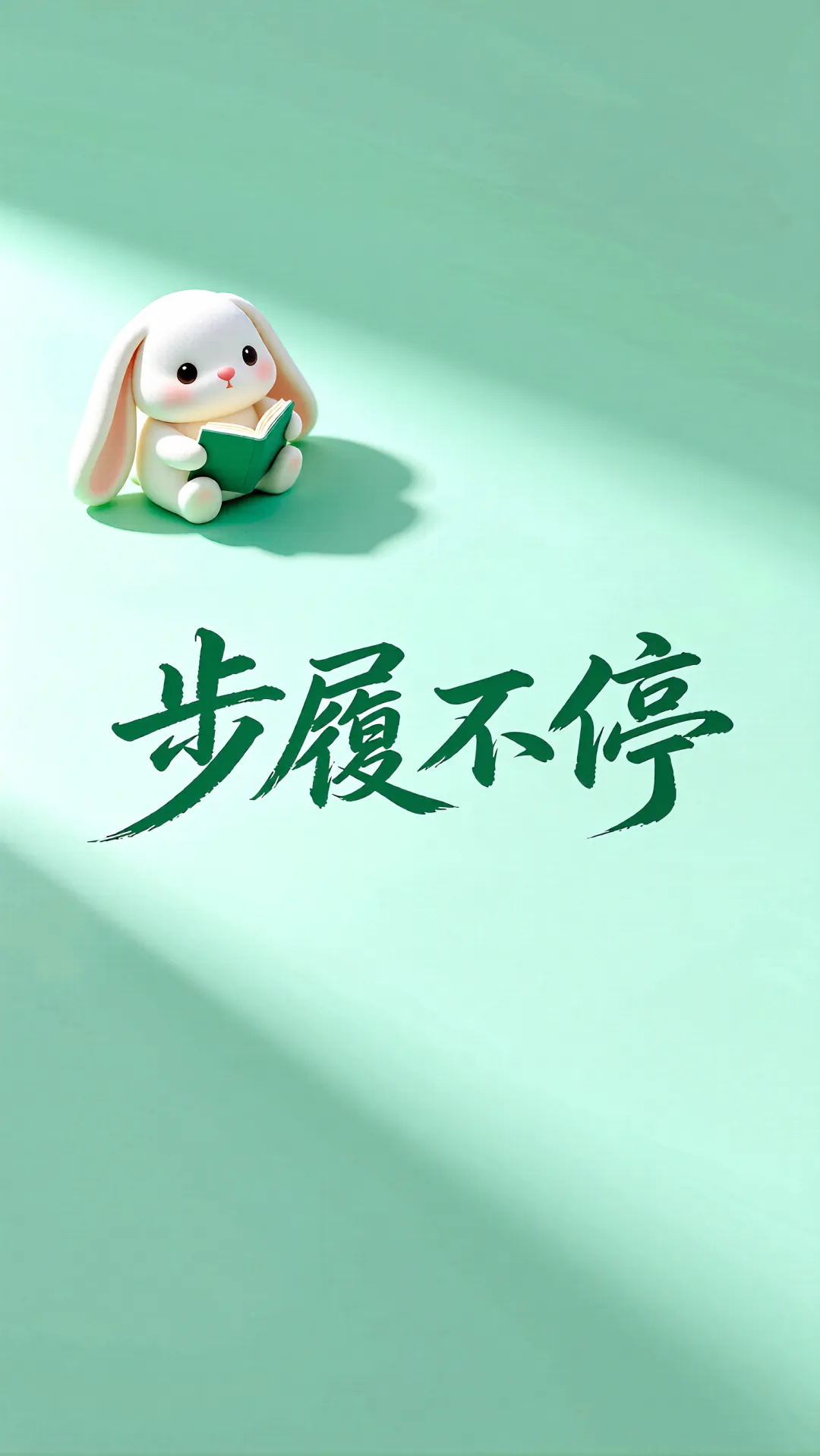 帮我生成一张9:16竖版高清图片,8K超高清,细节拉满,壁纸质感,光影柔和,颜色清爽柔和不刺眼,无水印、无杂乱背景,画面干净通透,镜头参数:f/1.8,ISO 100,快门1/125s,焦距50mm;软萌极简风,浅薄荷绿柔色底色,左上角放置卡通小兔子(垂耳抱书,圆眼睛呆萌,鼻尖粉嫩),毛笔字“步履不停”居中偏下,文字颜色选用深绿色(与浅薄荷绿底色形成柔和对比,醒目不突兀),比例协调(卡通形象占画面1/4,文字占1/5),干净无多余装饰,色调柔和统一,萌系又高级