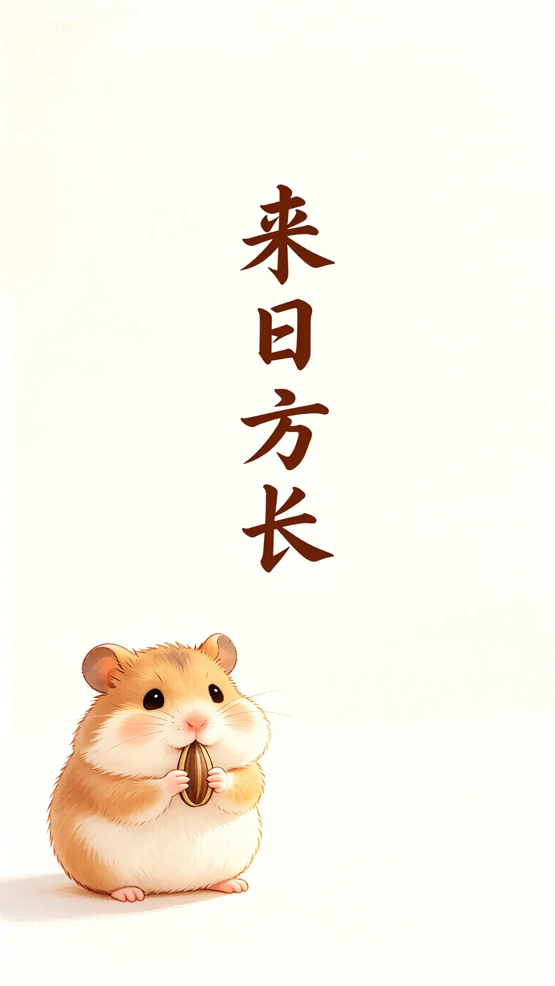帮我生成一张9:16竖版高清图片,8K超高清,细节拉满,壁纸质感,光影柔和,颜色清爽柔和不刺眼,无水印、无杂乱背景,画面干净通透,镜头参数:f/1.8,ISO 100,快门1/125s,焦距50mm;软萌治愈风,奶白色柔色底色,左下角放置软萌卡通小仓鼠(鼓腮含瓜子,圆滚滚身子,耳朵小巧),毛笔字“来日方长”居中偏上,文字颜色选用深棕色(柔和不刺眼,与奶白色底色对比清晰,醒目易读),比例协调(卡通形象占画面1/4,文字占1/5),简约干净,色调柔和,萌系又治愈