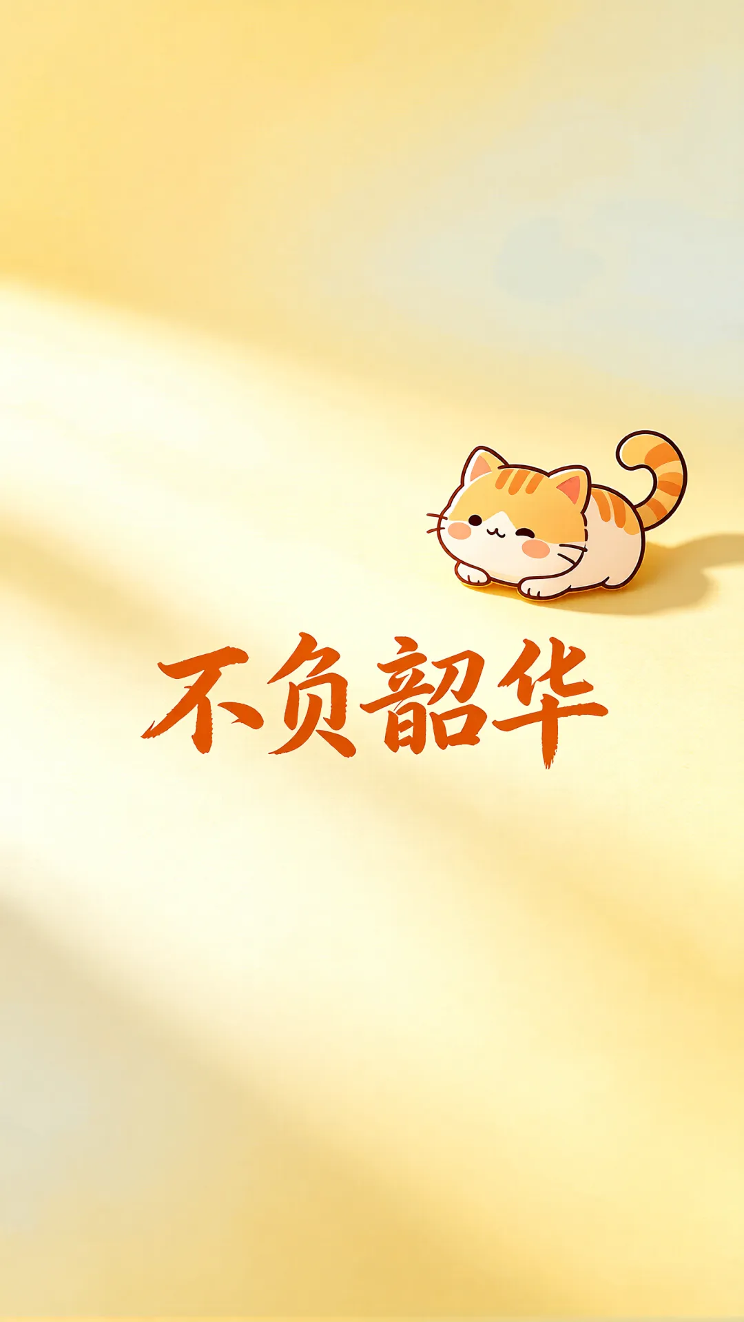 帮我生成一张9:16竖版高清图片,8K超高清,细节拉满,壁纸质感,光影柔和,颜色清爽柔和不刺眼,无水印、无杂乱背景,画面干净通透,镜头参数:f/1.8,ISO 100,快门1/125s,焦距50mm;软萌治愈风,浅黄柔色底色(带淡光渐变),右上角放置卡通小猫咪(歪头卖萌,尾巴卷翘,脸颊带腮红),毛笔字“不负韶华”居中偏下,文字颜色选用深橘色(与浅黄底色形成柔和对比,醒目易读,不突兀),比例协调(卡通形象占画面1/4,文字占1/5),无多余装饰,色调统一,萌系又好看