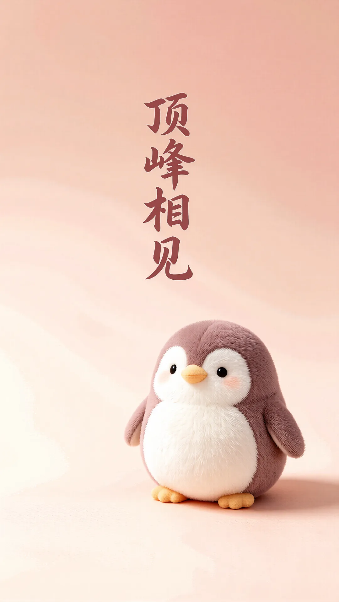 帮我生成一张9:16竖版高清图片,8K超高清,细节拉满,壁纸质感,光影柔和,颜色清爽柔和不刺眼,无水印、无杂乱背景,画面干净通透,镜头参数:f/1.8,ISO 100,快门1/125s,焦距50mm;软萌治愈风,浅豆沙柔色底色,右下角放置卡通小企鹅(圆滚滚呆萌站姿,嘴巴浅黄,肚子雪白),毛笔字“顶峰相见”居中偏上,文字颜色选用深豆沙色(与底色呼应且对比清晰,醒目易读),比例协调(卡通形象占画面1/4,文字占1/5),简约干净,色调柔和,萌系励志感拉满