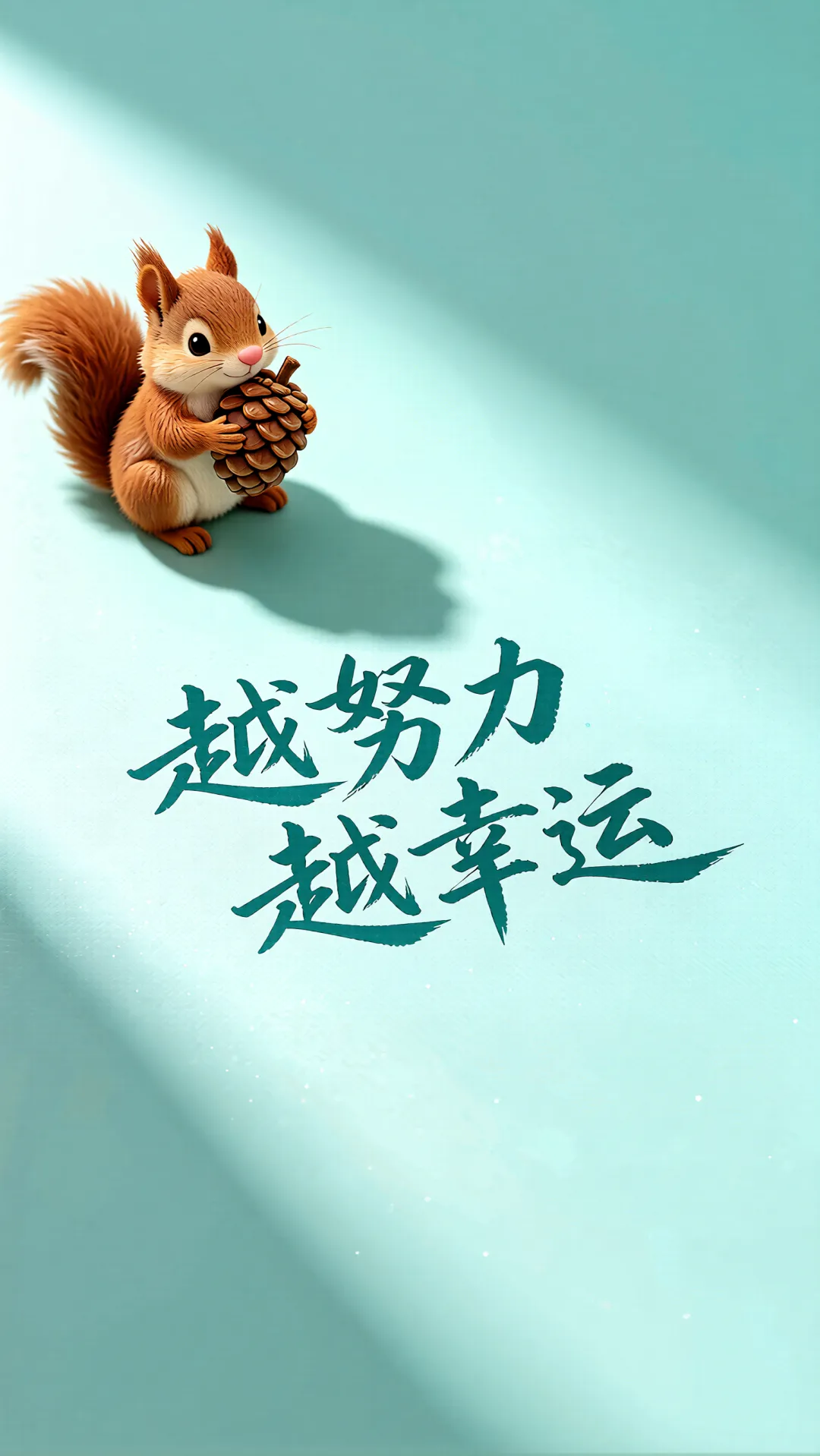 帮我生成一张9:16竖版高清图片,8K超高清,细节拉满,壁纸质感,光影柔和,颜色清爽柔和不刺眼,无水印、无杂乱背景,画面干净通透,镜头参数:f/1.8,ISO 100,快门1/125s,焦距50mm;软萌清爽风,淡浅青柔色底色,左上角放置卡通小松鼠(抱松果歪头,尾巴蓬松,鼻尖粉嫩),毛笔字“越努力越幸运”居中偏下,文字颜色选用深青色(与浅青底色对比清晰,醒目不突兀),比例协调(卡通形象占画面1/4,文字占1/5),细碎柔光点缀,干净治愈,萌系又励志