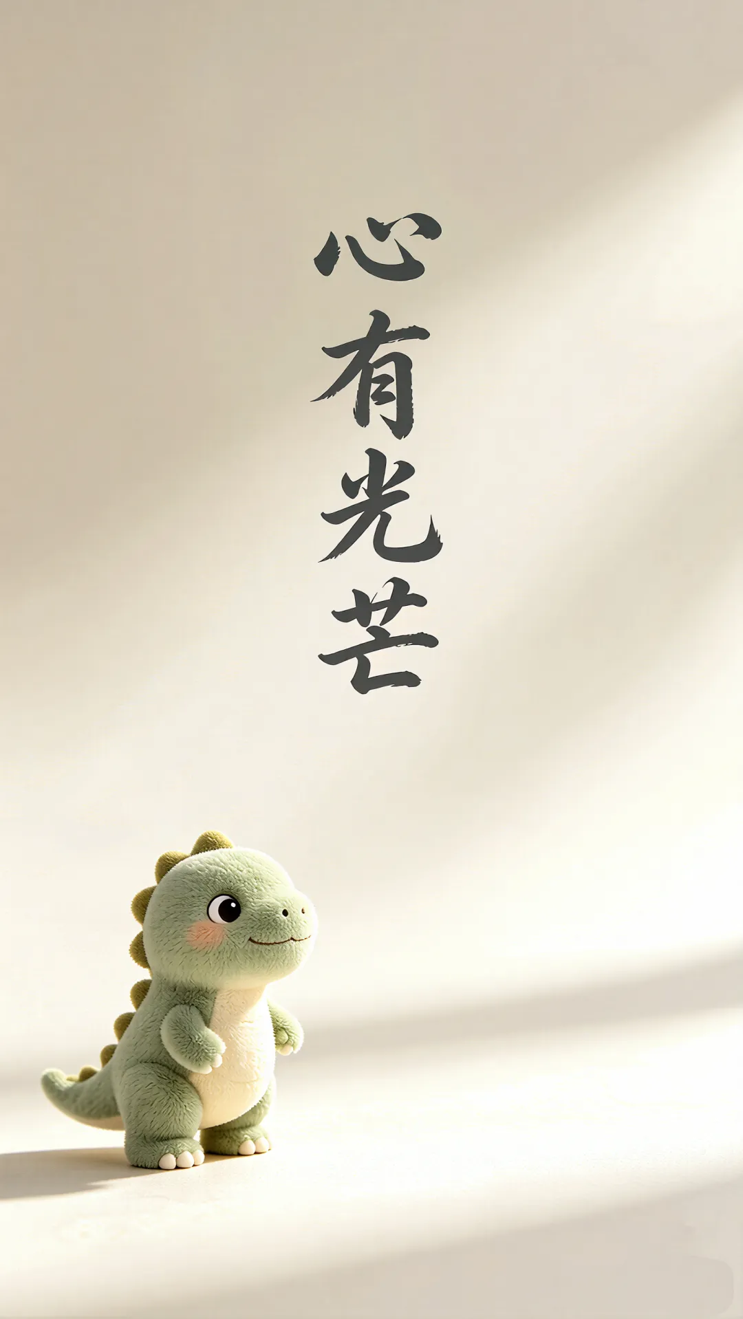 帮我生成一张9:16竖版高清图片,8K超高清,细节拉满,壁纸质感,光影柔和,颜色清爽柔和不刺眼,无水印、无杂乱背景,画面干净通透,镜头参数:f/1.8,ISO 100,快门1/125s,焦距50mm;软萌高级风,米灰色柔色底色,左下角放置卡通小恐龙(短腿圆身,乖巧站姿,眼睛圆溜溜),毛笔字“心有光芒”居中偏上,文字颜色选用深灰色(与米灰色底色对比清晰,醒目易读),比例协调(卡通形象占画面1/4,文字占1/5),极简线条点缀,清爽高级,萌系又有力量感