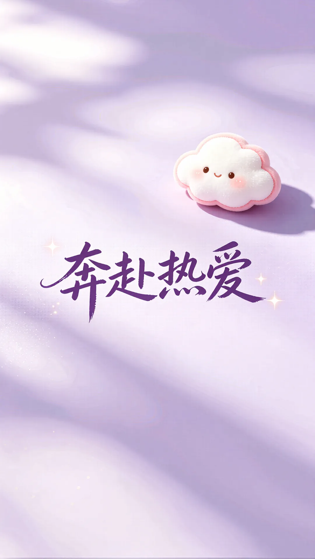 帮我生成一张9:16竖版高清图片,8K超高清,细节拉满,壁纸质感,光影柔和,颜色清爽柔和不刺眼,无水印、无杂乱背景,画面干净通透,镜头参数:f/1.8,ISO 100,快门1/125s,焦距50mm;软萌温柔风,淡浅紫柔色底色,右上角放置卡通小云朵(软乎乎造型,带浅粉边),毛笔字“奔赴热爱”居中偏下,文字颜色选用深紫色(与淡浅紫底色对比清晰,醒目不突兀),比例协调(卡通形象占画面1/4,文字占1/5),零星光斑点缀,简约干净,温柔又萌系