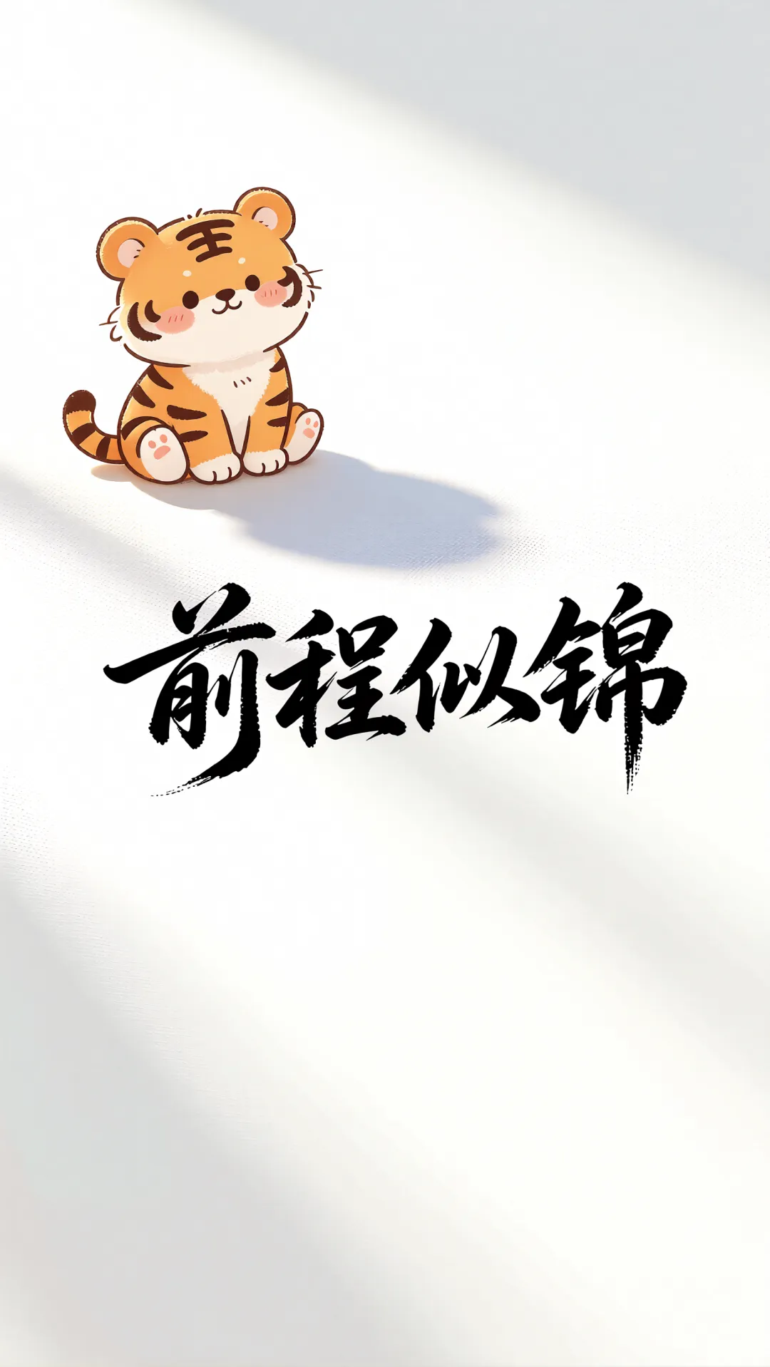 帮我生成一张9:16竖版高清图片,8K超高清,细节拉满,壁纸质感,光影柔和,颜色清爽柔和不刺眼,无水印、无杂乱背景,画面干净通透,镜头参数:f/1.8,ISO 100,快门1/125s,焦距50mm;软萌高级风,奶白色柔色底色,左上角放置卡通小老虎(乖巧坐姿,耳朵圆润,脸颊带腮红),毛笔字“前程似锦”居中偏下,文字颜色选用深黑色(与奶白色底色对比强烈,醒目易读,不沉闷),比例协调(卡通形象占画面1/4,文字占1/5),淡浅灰柔光阴影,无多余装饰,清爽高级又萌系