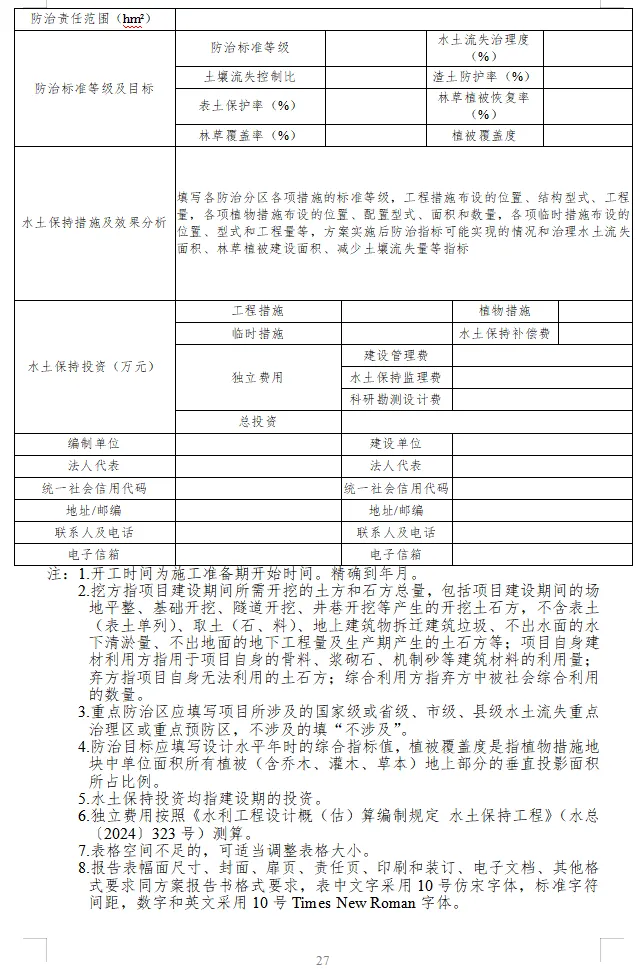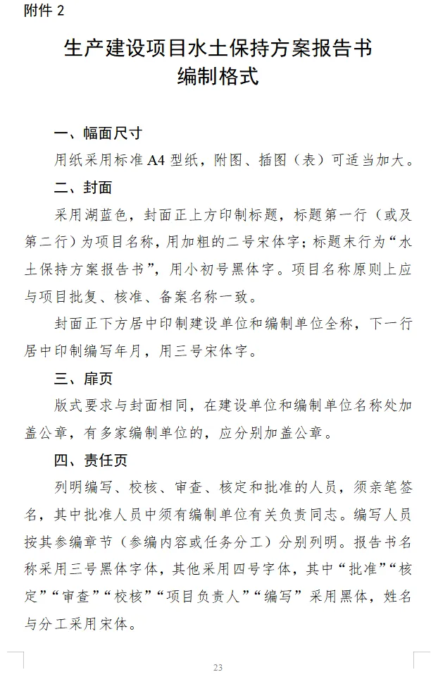为贯彻落实《生产建设项目水土保持方案管理办法》(水利部令第53号),进一步规范编制生产建设项目水土保持方案报告书和报告表,切实提高水土保持方案针对性和实用性,我部制定了《生产建设项目水土保持方案报告书编制内容》《生产建设项目水土保持方案报告书编制格式》《生产建设项目水土保持方案报告表编制内容及格式》。现印发给你们,请遵照执行。本通知自印发之日起实施,2026年6月1日后不再接收不符合模版要求的内容和格式编制的水土保持方案。
