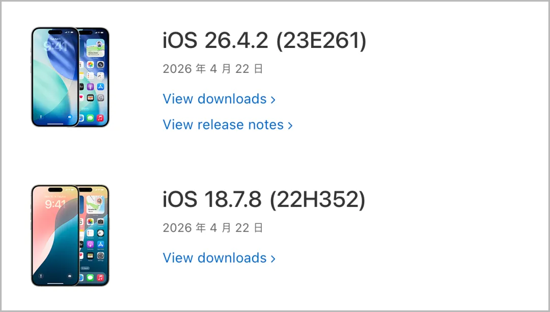 今日凌晨,苹果向用户推送了 iOS 双系统版本更新。分别为:iOS 26.4.2 正式版(版本号为:23E261)和 iOS 18.7.7 正式版(版本号:22H352),共两个正式版本。这两个版本未经测试版,属于突然推送的系统版本。