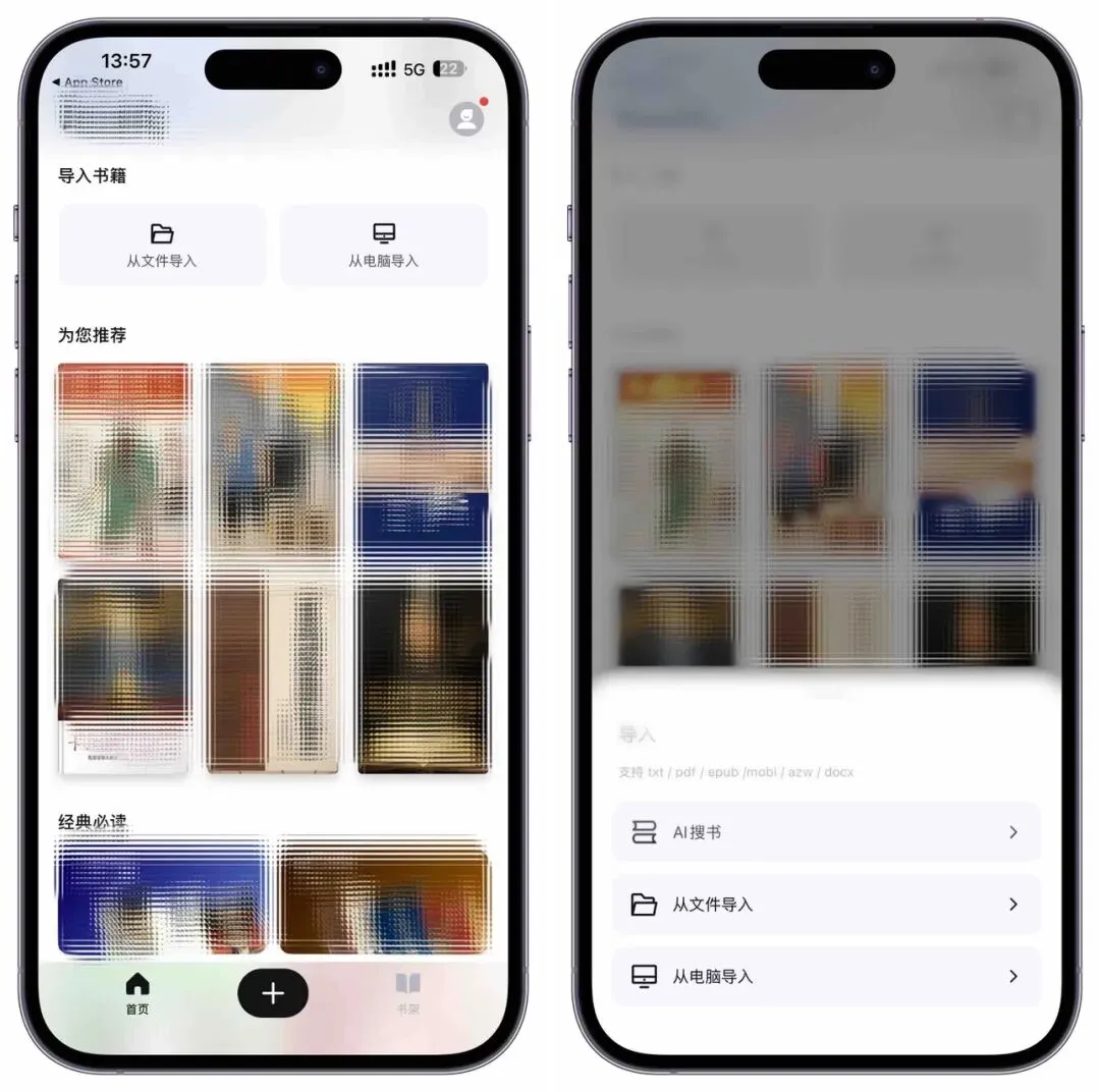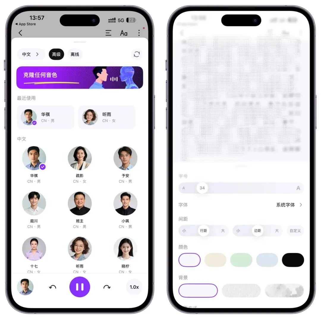 支持免费自由导入书籍及听书同时兼容PDF、epub、txt、azw3、mobi、docx 全格式文档导入,关键是PDF格式也可自动转换为电子书另外还内置公版书库没有本地也可直接搜索阅听,它搭载自研大模型 AI 语音朗读拥有 100+ 种 AI 音色、支持 40+ 种语言并还可自定义声音克隆录制音频或上传音频即可随意克隆且支持离线朗读、倍速朗读等,除了听它还有纯阅读模式该有的调字号、背景等阅读设置它基本都具备另外它还配备许多实用功能定时关闭、划线笔记、等等