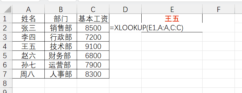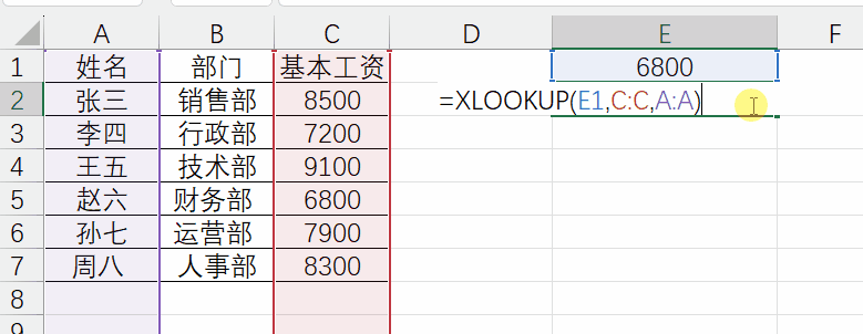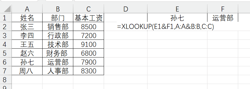 使用举例:根据姓名+部门在薪资表中,查找一个名字的基本工资,VLOOKUP需要通过连接字段或多层嵌套解决,麻烦且容易出错;XLOOKUP 连接符号 & 即可完成多条件查找