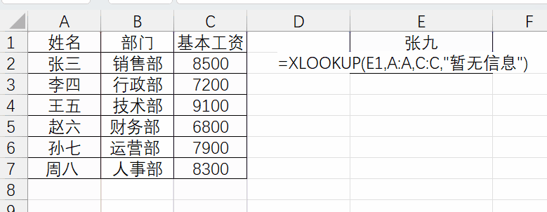 =XLOOKUP(E1,A:A,C:C,"暂无信息")