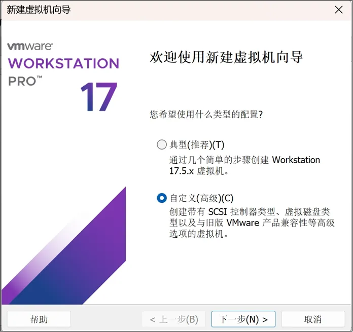 2.1在VMware主界面,点击右侧的创建虚拟机,打开如下界面。