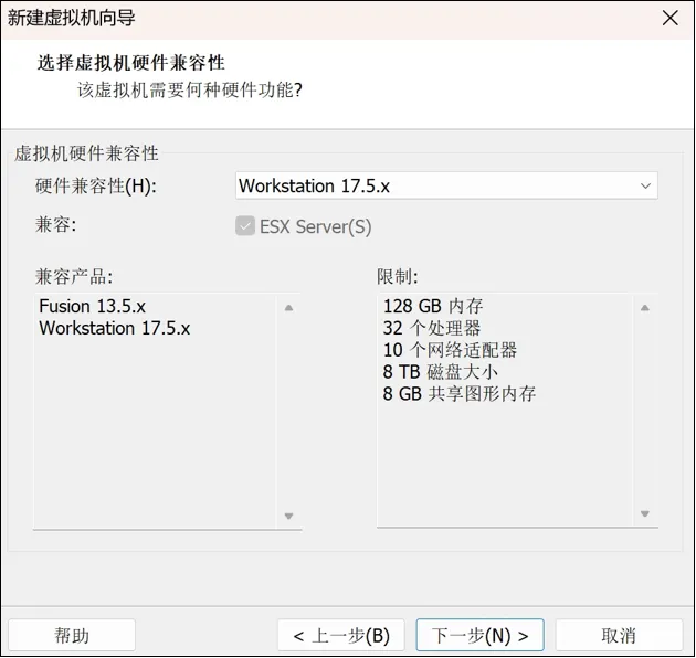 2.3硬件兼容性选择17.x,我这里是因为我的版本是17.5,所以选择17.5及以上。点击下一步