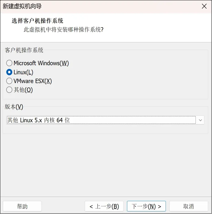 2.5客户机操作系统选择Linux,版本选择Linux5.x内核64位。点击下一步