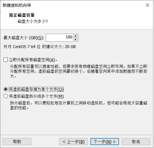 2.9磁盘容量设置100G,如果个人电脑空间不够,可以设置50G。不要太小。将虚拟盘设置位单个位置,点击下一步。