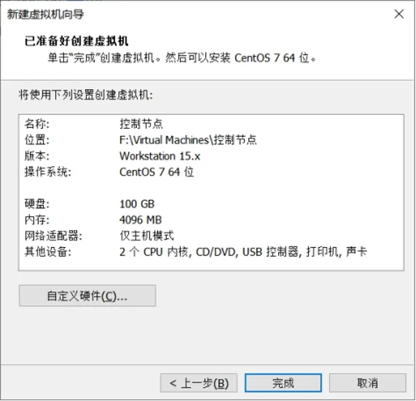 2.7接下来设置处理器(可以设置2处理器,每个2内核),内存(设置4G),网络(设置“仅主机模式”)控制器类型(默认选择,不变),磁盘类型(默认选择,不变)。每个都是设置完后点击下一步,一直到这里: