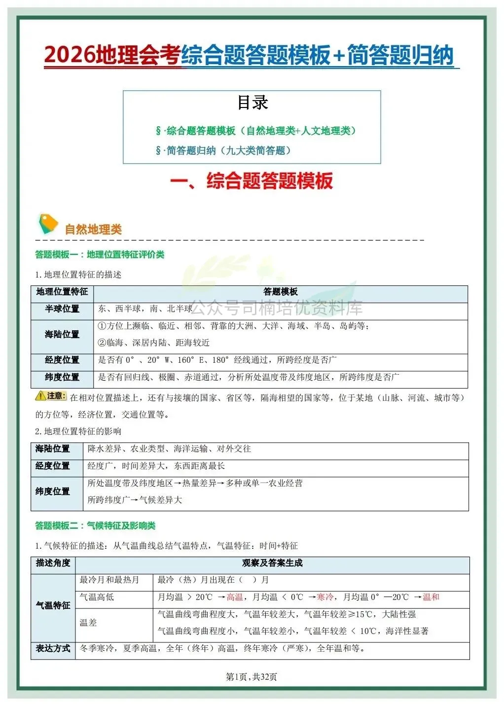 今日分享:2026地理会考综合题答题模板+常考简答题归纳,推荐老师和家长们收藏打印让孩子练习,助力孩子提高成绩!