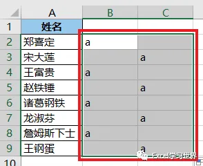 11. 拖动加宽 A 列的列宽,宽到足以放置所有合并后的姓名。