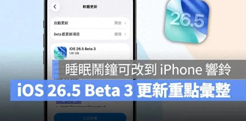 苹果发布iOS 26.5第三个Beta 更新,iOS 26.5 Beta 3 同样主要侧重于改进效能细节与错误修正;其中一个值得注意的更新重点是「睡眠闹钟」加入「总是在iPhone 上播放」选项,让用户戴着Apple Watch 入睡时也能把闹钟响铃改到iPhone 上播放,是一个体验升级的新功能,这边也整理五个iOS 26.5 Beta 3 的更新重点给你参考。