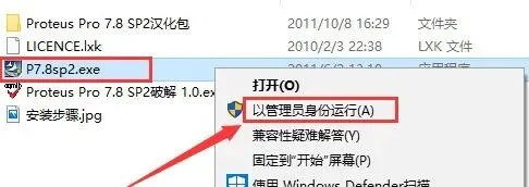 14、打开之前解压后的【Proteus 7.8】文件夹,选中【Proteus Pro 7.8 SP2破解 1.0.exe】文件,鼠标右击选择【以管理员身份运行】。