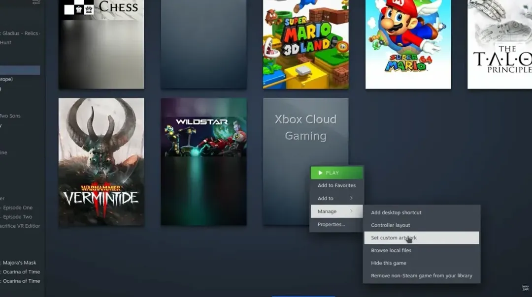 最后设置游戏封面图。返回Steam库列表界面,右键点击“Xbox Cloud Gaming”图标,选择“管理(Manage)>设置自定义封面(Set custom artwork)”,然后选择对应的竖版Capsule图片进行替换。设置完成后,该应用在库中的展示效果将与其他游戏保持一致,从而实现更高的界面一致性与沉浸感。