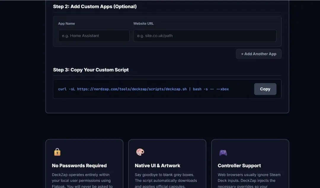 相比手动配置方案,社区工具“DeckZap”提供了更简化的解决方案。其核心思路是通过脚本自动完成所有配置步骤,包括浏览器安装、快捷方式创建以及界面美化等 。