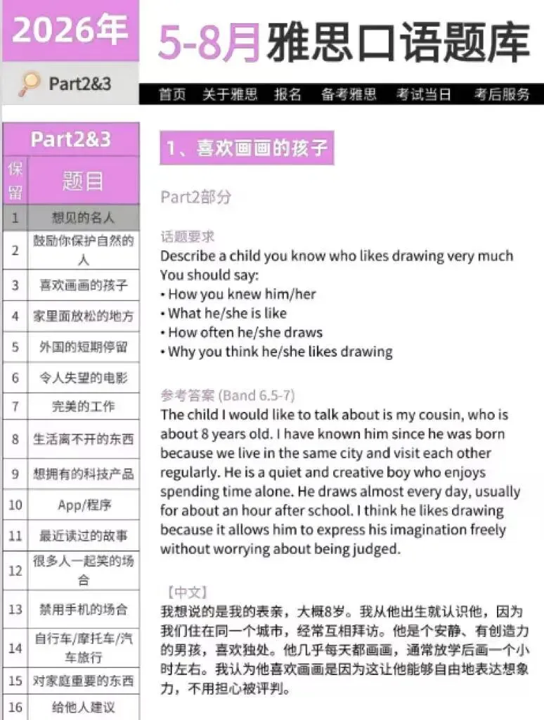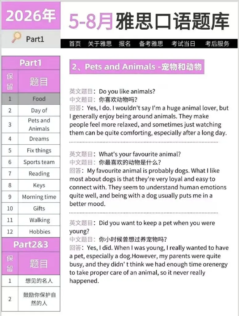 💥 划重点!2026年5-8月雅思口语题库所有题目都配齐答案 + 音频!全部内容由高分雅思口语名师执笔编写,涵盖最新话题题干、7.5分口语示范答案,还有配套音频跟读!备考直接抄作业!