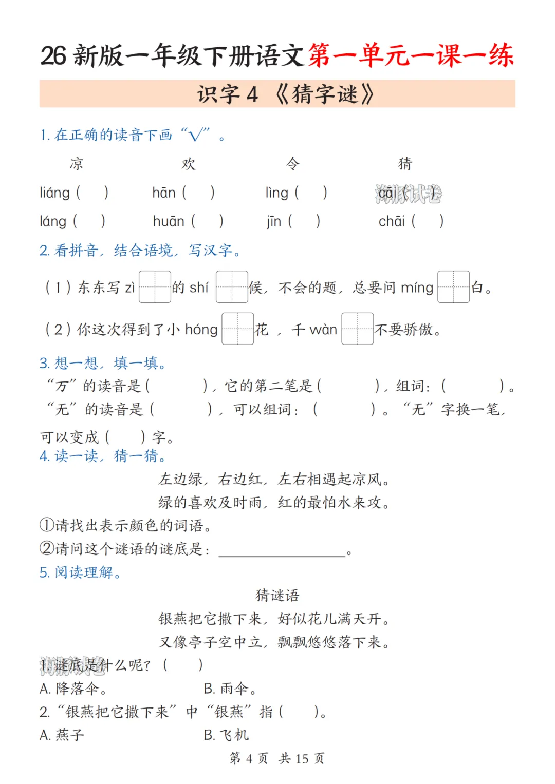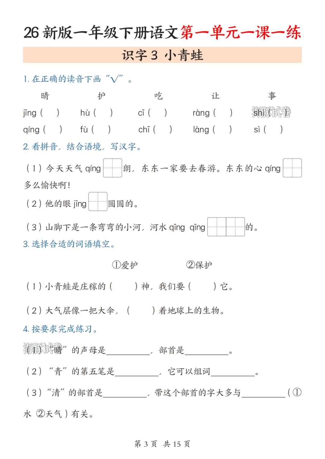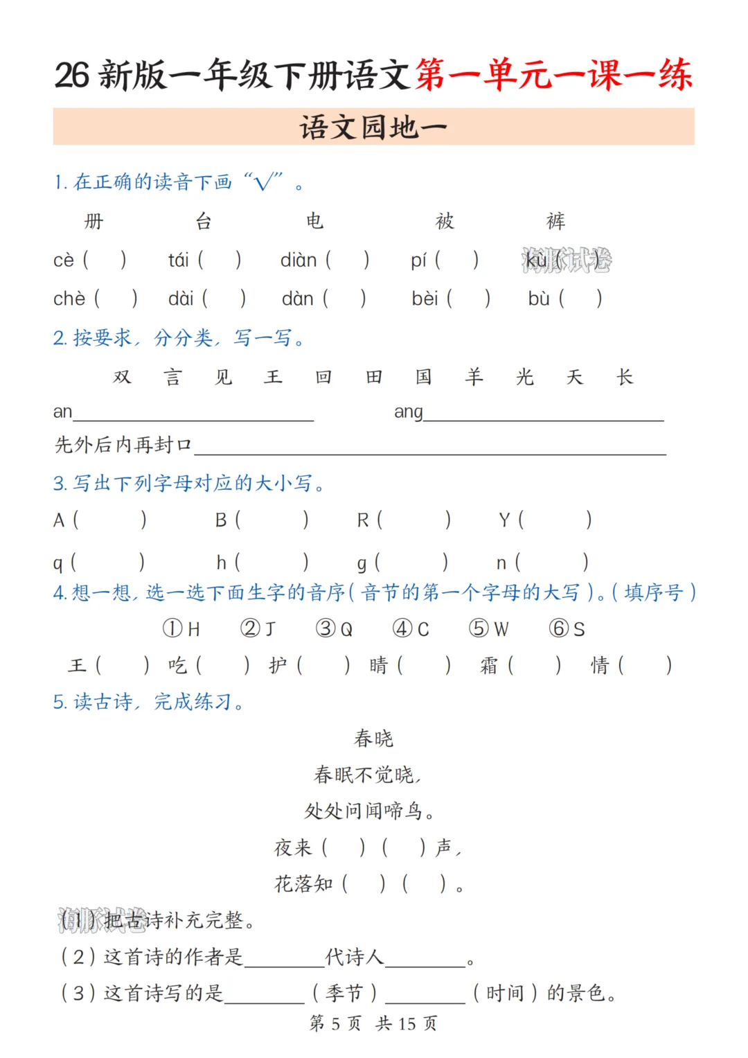 一年级(下)语文1-8单元一课一练