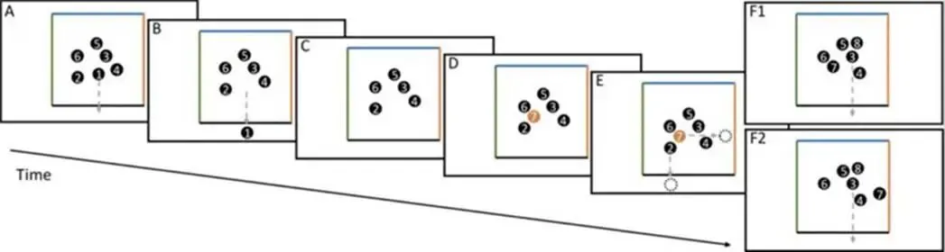 一项研究发现,当一部分特殊球(如图D 球7)需要被记忆并在完成其他事项后被拖到特殊位置时,如果被试将这些球提前移动到目标位置附近作为提示,即进行了意图卸载,被试的任务表现将大大提高[6]。
