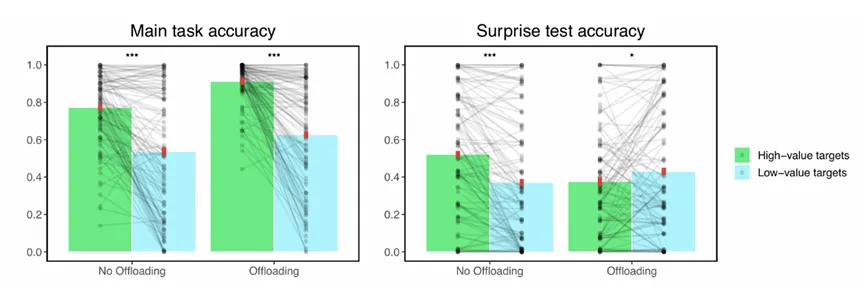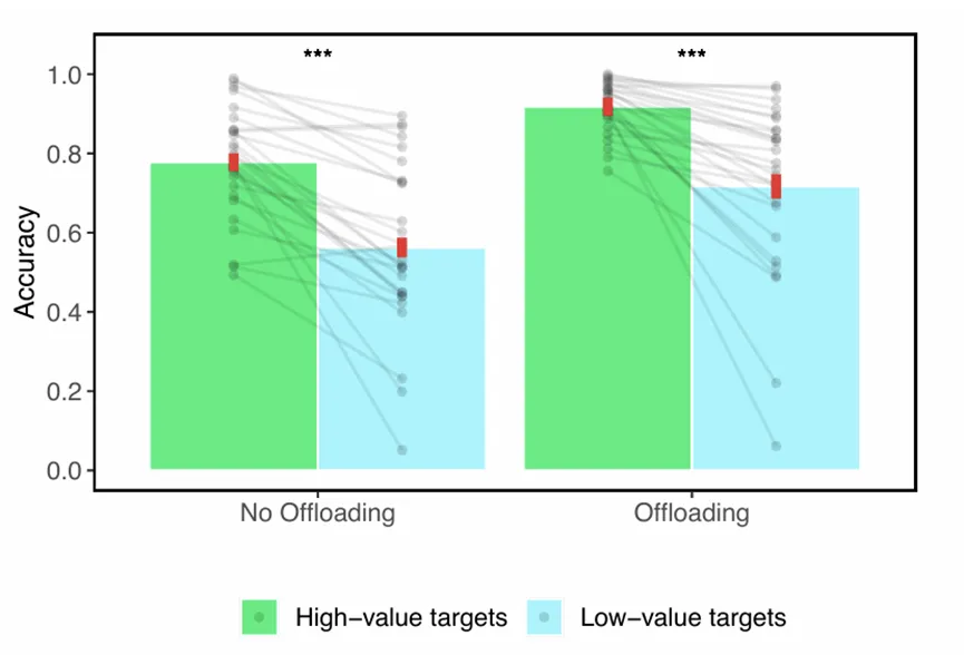 最开始,他们只是想探究价值和认知卸载的关系,却意外地发现被试虽然会优先卸载高价值球,但任务表现提升最多的却是低价值球的任务。