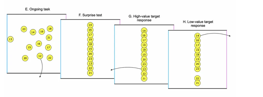 于是研究人员又加上了一个随机触发的实验:在高价值球被提前移动到目标地点附近后,让所有需要被完成的意图卸载的球和其他球重新排成一条直线,消除意图卸载的标记,让被试继续按顺序把球拖动到指定位置。