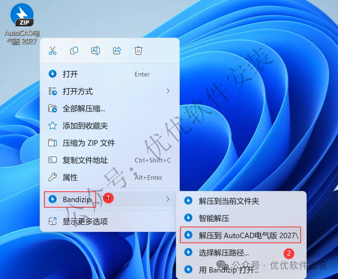 1、下载AutoCAD电气版 2027软件安装包到电脑上,右键选择【解压到AutoCAD电气版 2027\】