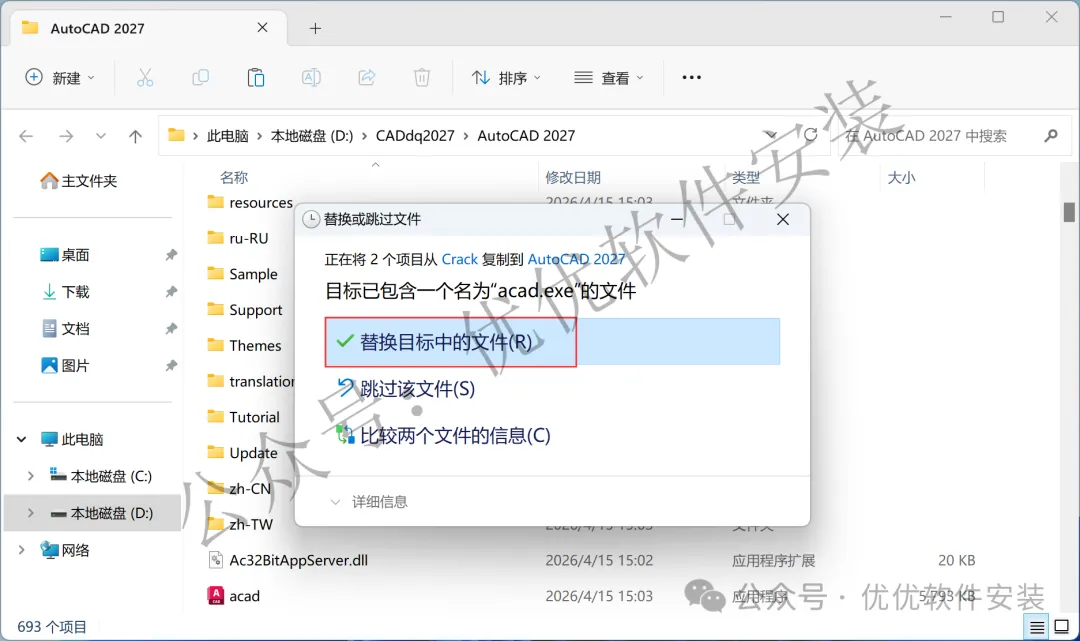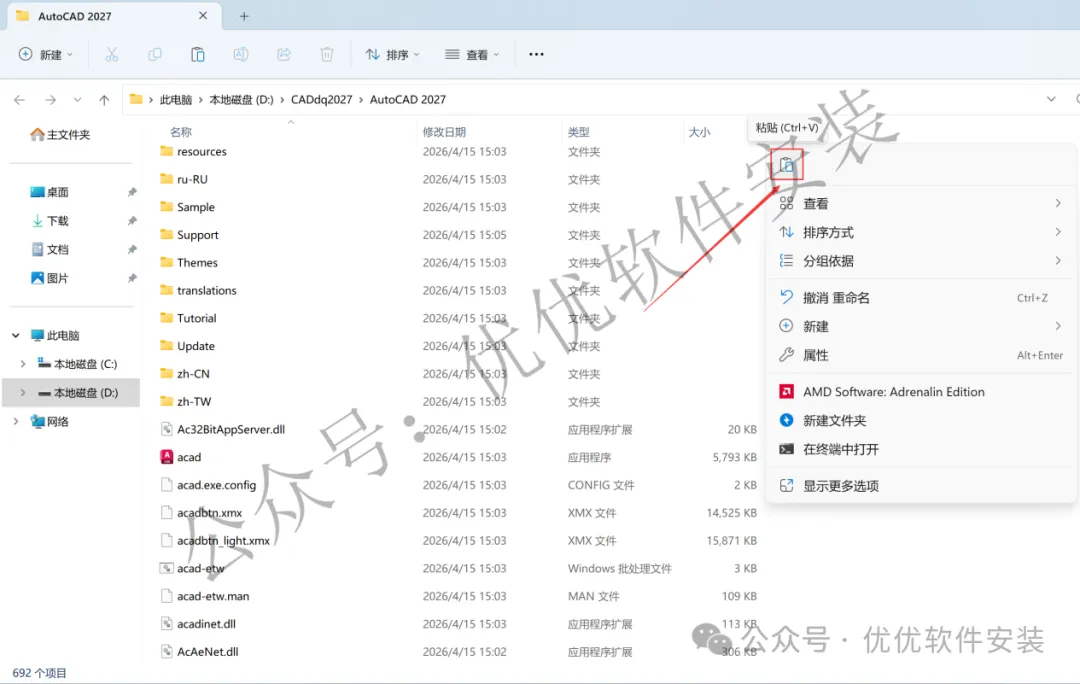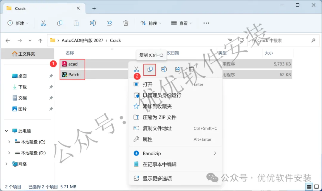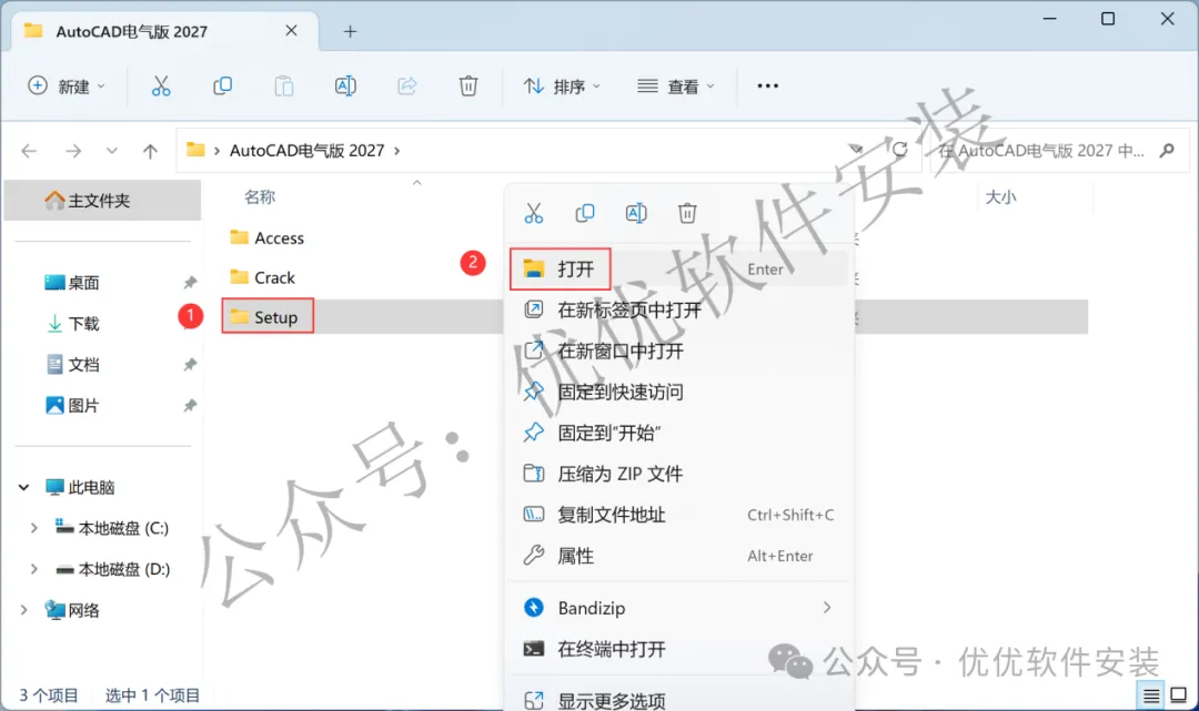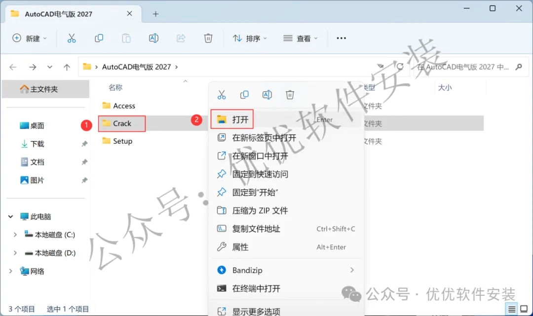 10、回到AutoCAD电气版 2027文件夹,找到【Crack】文件夹,右键【打开】它