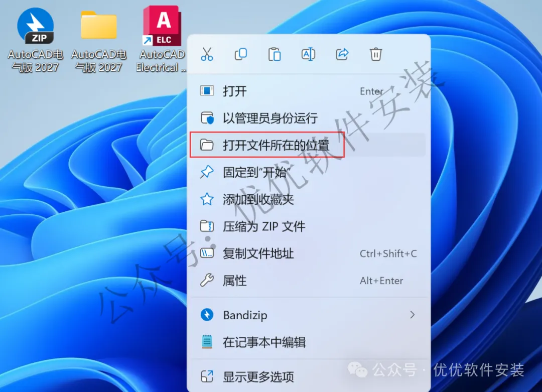 12、回到桌面,右键桌面上的【AutoCAD Electrical 2027软件图标】,点击【打开文件所在的位置】