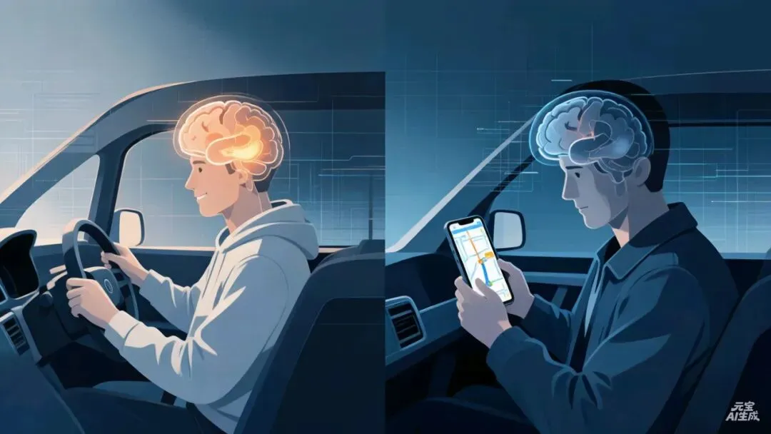 对此我也深有体会:早年出行,粗略浏览地图便能记住路线;如今长期依赖导航,连熟悉路段也会失去自主辨路能力。大脑像一块偷懒的肌肉,你不练,它就真躺平了。