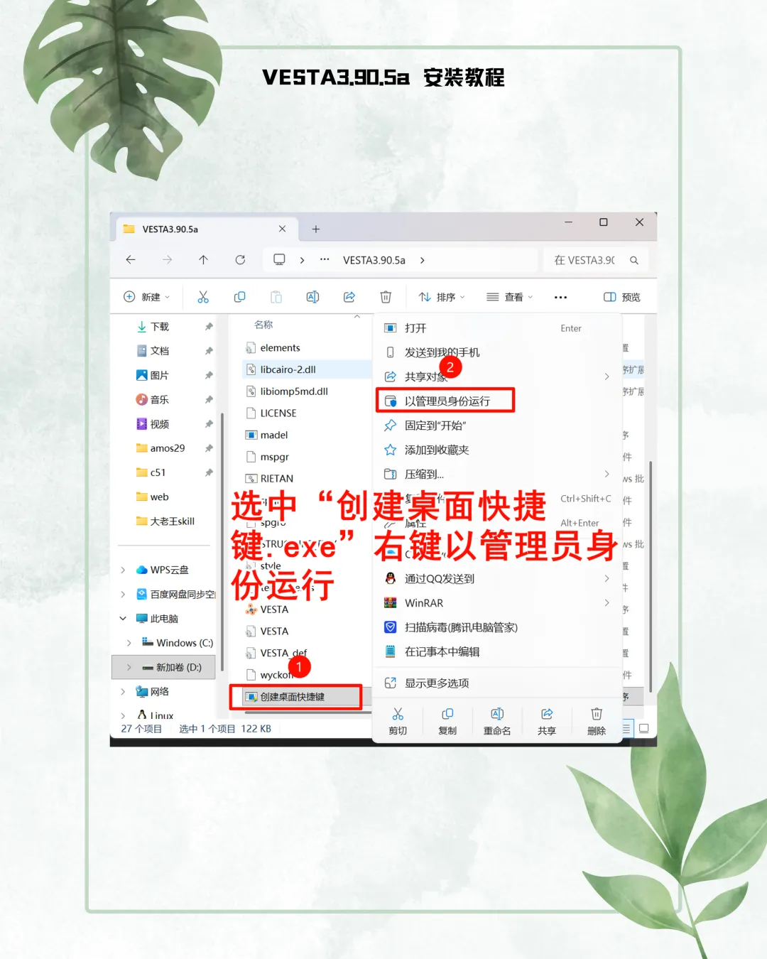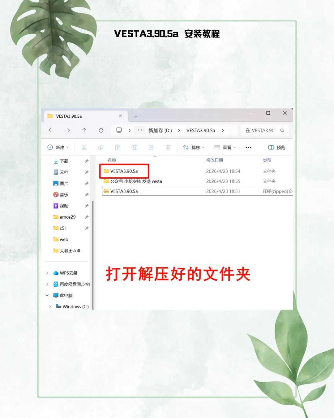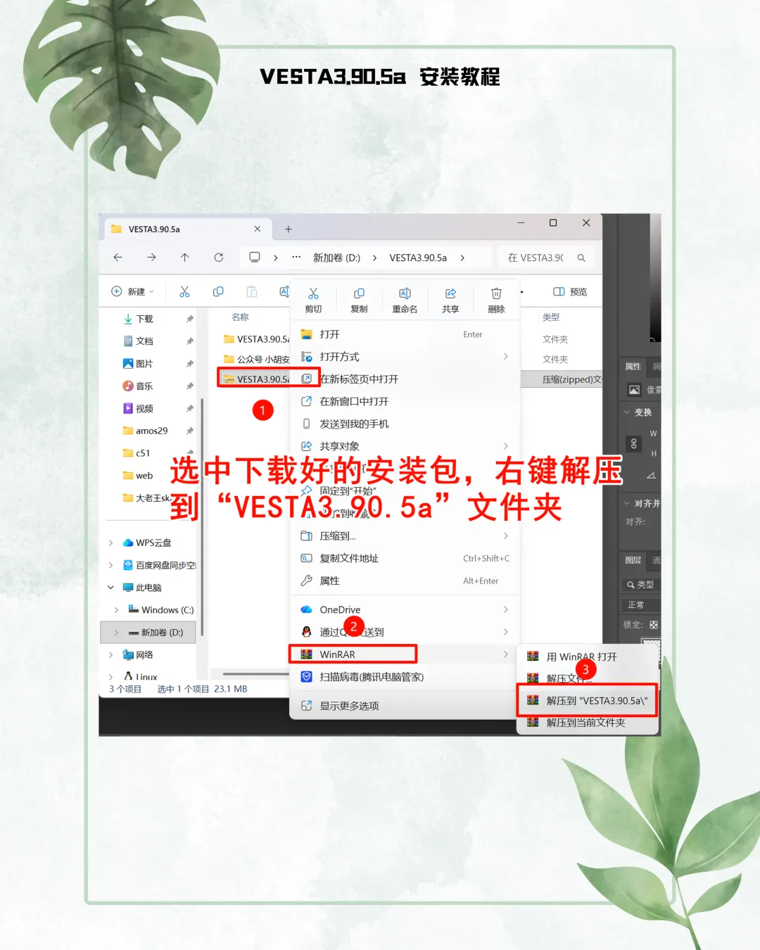 1. 解压规范:选中安装包,右键点击选择【解压到 VESTA3.90.5a】文件夹。