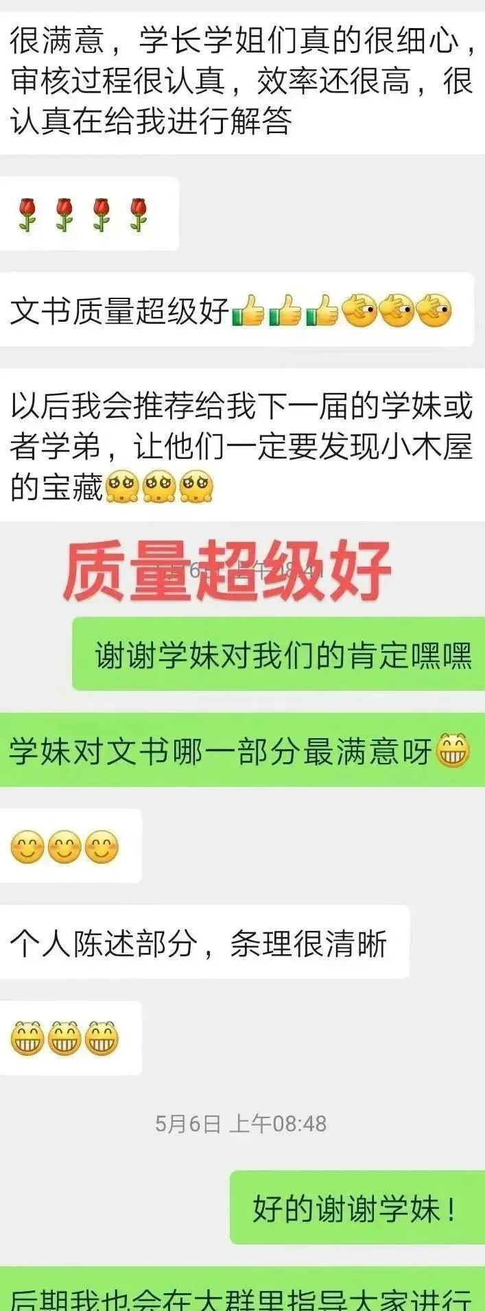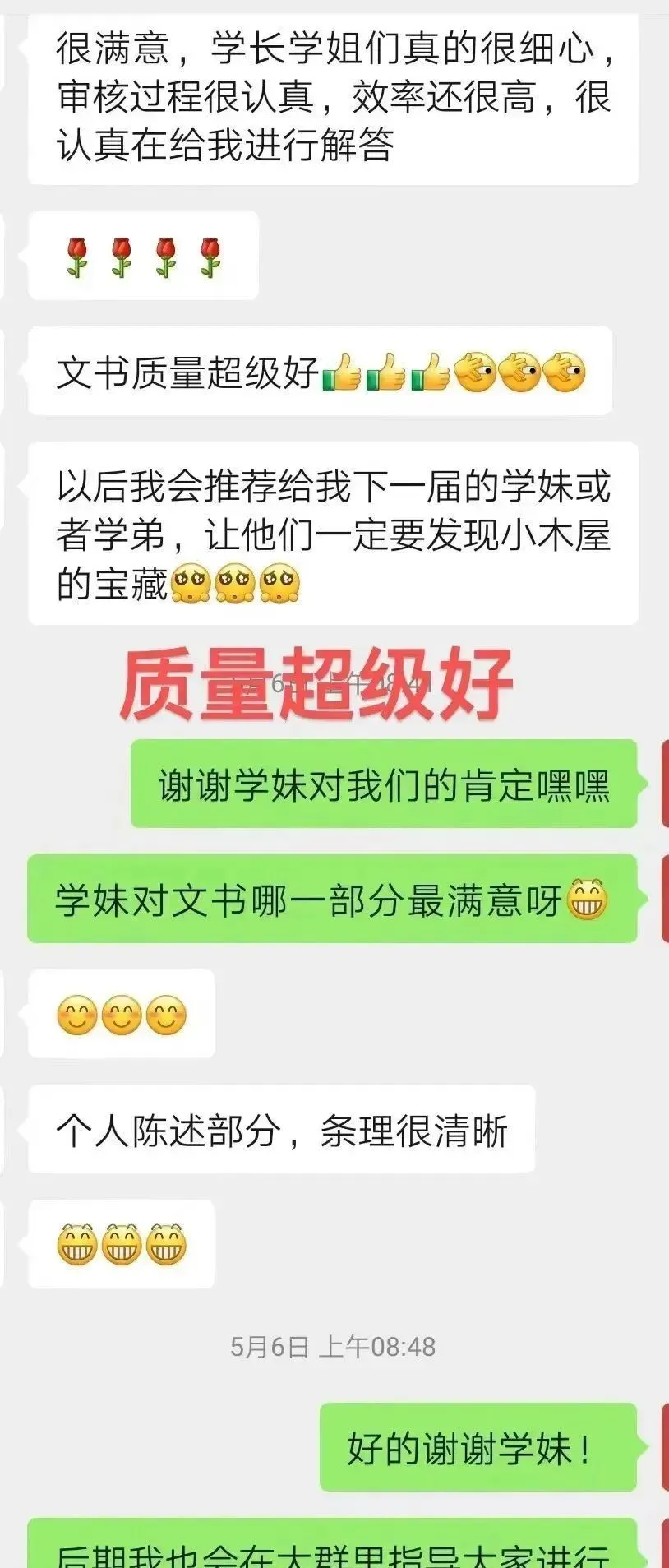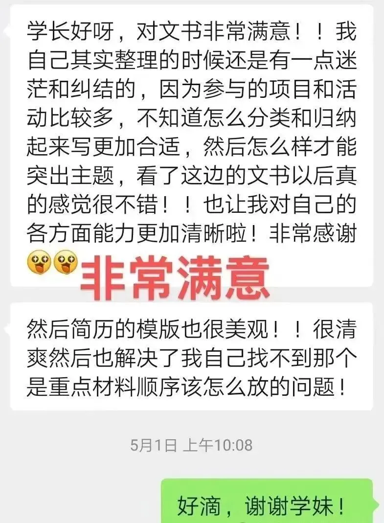小木屋文书团队导师具有丰富的文书撰写经验,在2024年推免过程中,小木屋文书团队齐心协力,帮助学弟学妹打磨出一份份精彩的文书,获得学弟学妹们的一致好评。在文书撰写过程中,学长学姐与学弟学妹们都收获颇多,今年,老学长学姐们将继续带着24年的收获更好地服务新一届的学弟学妹!