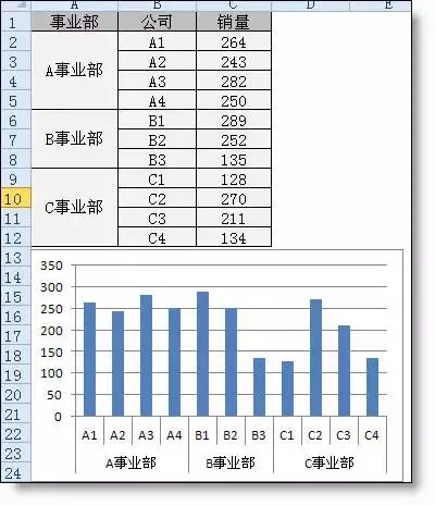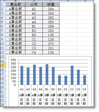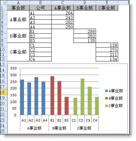 再改造一下源数据,图表上的柱子分事业部显示不同的颜色。