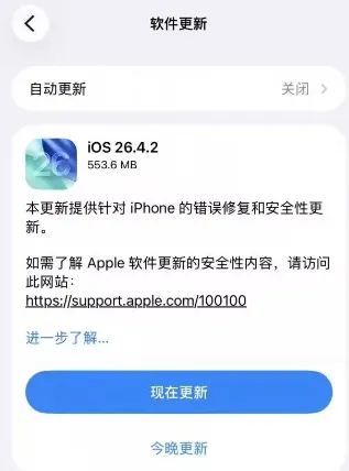 很多人看到 iPhone 推送一个尾号很小的正式版更新,第一反应往往都是先放着,等别人试完再说,因为这类版本通常没有界面变化,也没有新功能介绍,看上去像是一次存在感很低的例行维护,但这次情况不太一样,iOS 26.4.2 虽然依旧属于小版本补丁,可它真正要处理的,不是体验层面的细枝末节,而是通知数据没有被彻底清干净的问题