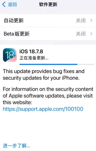 除了 iOS 26.4.2,这次苹果还同步推出了 iOS 18.7.8,两者思路一样,都是以修复为主,只是面向的设备范围不同,前者给已经在 iOS 26 系列上的机型使用,后者则主要照顾还停留在 iOS 18 的老设备,比如 iPhone XR、iPhone XS 和 iPhone XS Max,也就是说,苹果这次不是单纯给新系统打补丁,而是连无法继续升大版本的旧机型也一起兜住,避免老用户因为系统代差而暴露在同类风险里