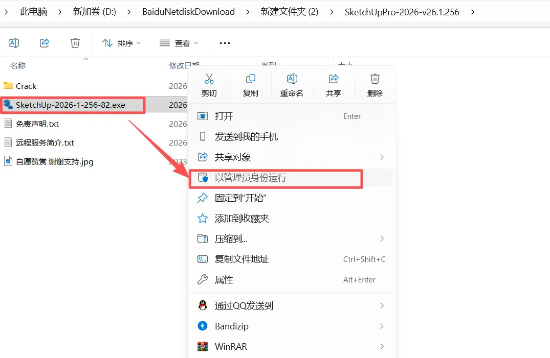 2.进入解压后的【SketchUpPro-2026-v26.1.256】文件夹,右击【SketchUp-2026-1-256-82】,选择【以管理员身份运行】。