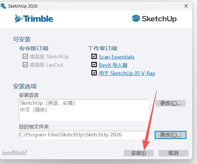 3.点【安装】(为方便后续给SU装插件,所以安装在默认文件夹)。