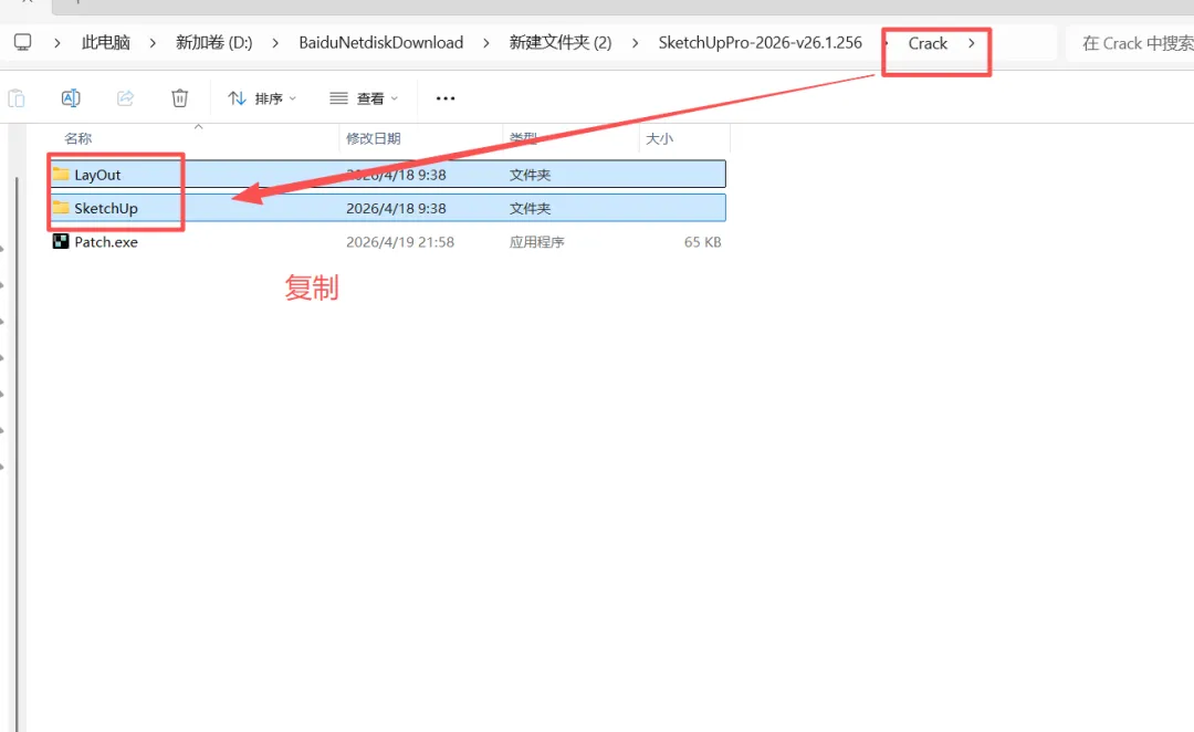 6.打开【Crack】文件夹,复制【LayOut】、【SketchUp】文件。