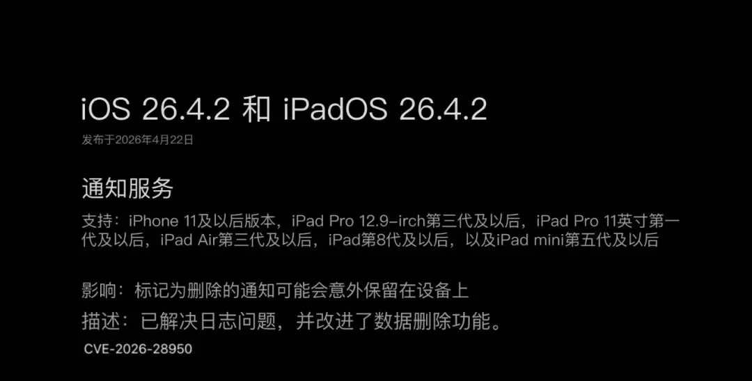 2026年4月23日凌晨,苹果向iPhone和iPad用户推送 iOS 26.4.2 与 iOS 18.7.8 双版本更新,核心目标直指一项被FBI曝光的通知服务漏洞,无新增功能,聚焦安全修复。