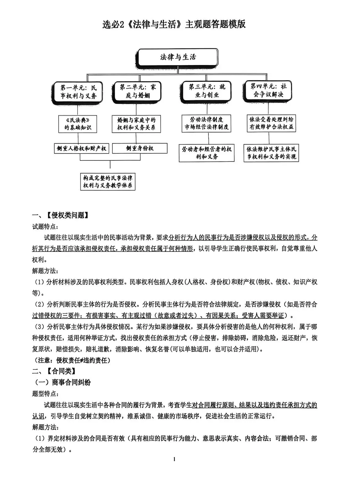 各位同学好!高中政治选必二《法律与生活》知识点贴近实际,但案例复杂、设问灵活,在主观题作答中常常难以形成清晰的逻辑链条。我们现参照经典格式,将全书核心考点整合为五大专题答题模板,帮助你快速锁定知识模块,规范答题语言,实现精准作答。