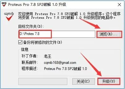 15、选择软件的安装目录(参照第8步软件安装路径),我这里是【D:/Proteus 7.8】,然后点击【升级】。