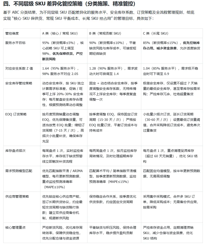 A类核心SKU:高服务水平(95%及以上)、高预测频次(月度更新)、充足安全缓冲、严控库存周转,优先保障供货;